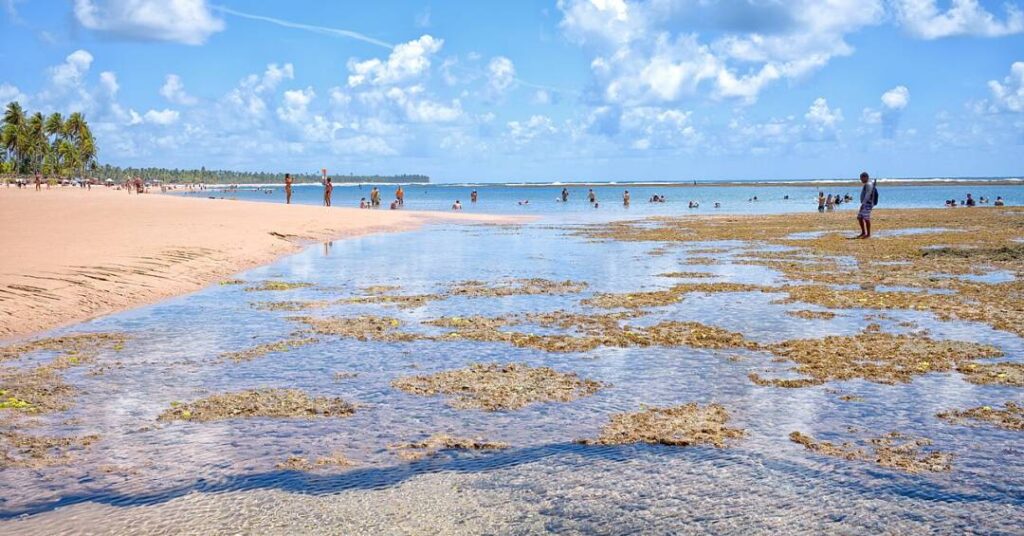 A cerca de 20 minutos de jardineira de Barra Grande, Taipu de Fora é o grande cartão-postal da península. A combinação de mar em tons claros, areia dourada e coqueiros já impressiona, mas é na maré baixa que o cenário se transforma: os recifes revelam piscinas naturais rasas e transparentes, cheias de peixes, acessíveis diretamente da praia, sem necessidade de barco. Na maré alta, Taipu segue valendo a visita – seja pelo visual da orla, seja pela facilidade de encontrar restaurantes e pousadas.