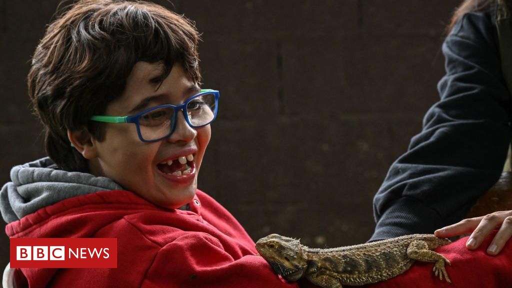 Foto de uma criança de óculos e blusa vermelha com um lagarto em seu braço.