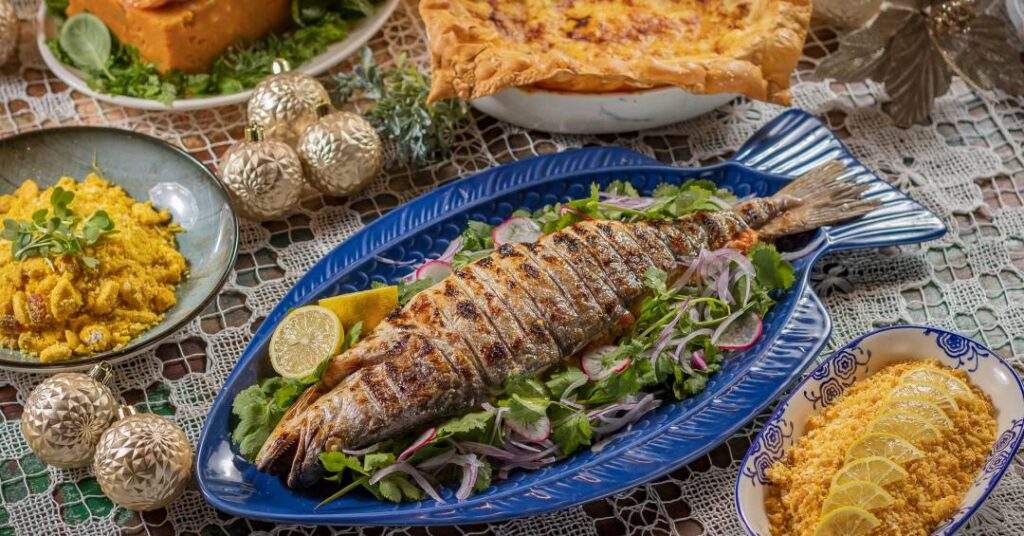 Azur do Mar > O restaurante dedicado aos peixes e frutos do mar tem menu para os festejos, com itens como o peixe recheado com farofa de camarão (R$ 215,00). Entre as opções de acompanhamentos, aparece a farofa de alho com limão (R$ 75,00). As encomendas podem ser feitas pelo Whatsapp até o dia 22 e a retirada dos pedidos será feita no dia 24. Rua Pedro Cristi, 89, Pinheiros, telefone e WhatsApp 98892-6667. Tem acessibilidade.