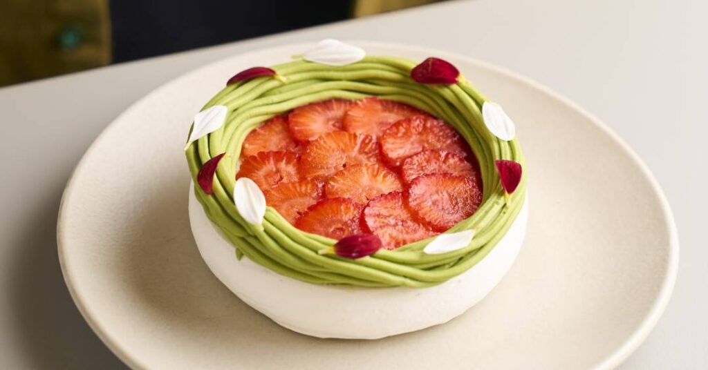 Uma delas é o targui (R$ 34,00), um merengue recheado de chantili de queijo mascarpone, doce de feijão-azuki, injeolmi (bolinho de arroz glutinoso polvilhado com farinha de soja torrada) e coulis de morango, finalizado com a fruta fresca e namelaka de matchá (ganache aerada de chocolate branco e chá verde).