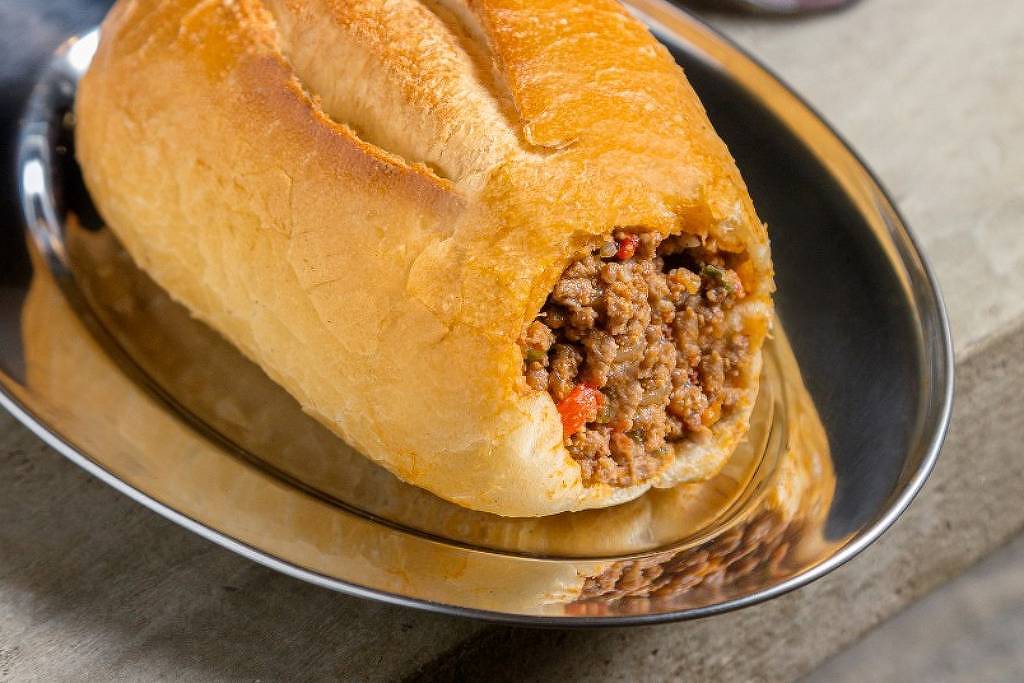 Remova uma das pontas do pão e tire o miolo, deixando uma cavidade. Preencha o buraco com a carne moída e coma imediatamente, pois o recheio tende a encharcar a casca do pão