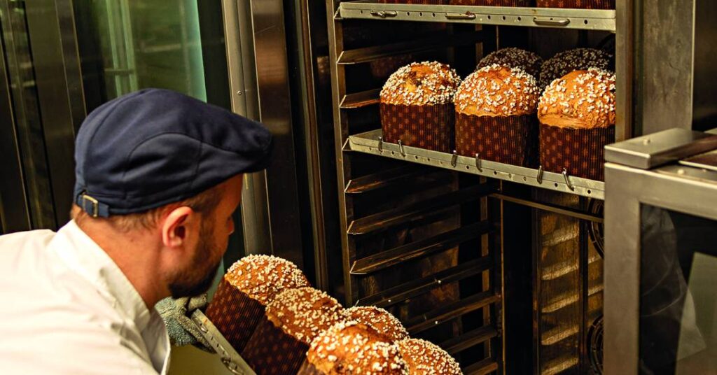 A massa é então disposta nas formas e descansa novamente para crescer. É só após ganhar uma cobertura açucarada de amêndoa, responsável por deixar a crosta da cúpula crocante, que vai ao forno. Depois de 32 minutos, o doce é retirado e imediatamente preso em ganchos, virado de ponta-cabeça, para que não fique abaulado — o famoso ato de “morcegar”. E assim permanece por doze horas para então ser embalado.