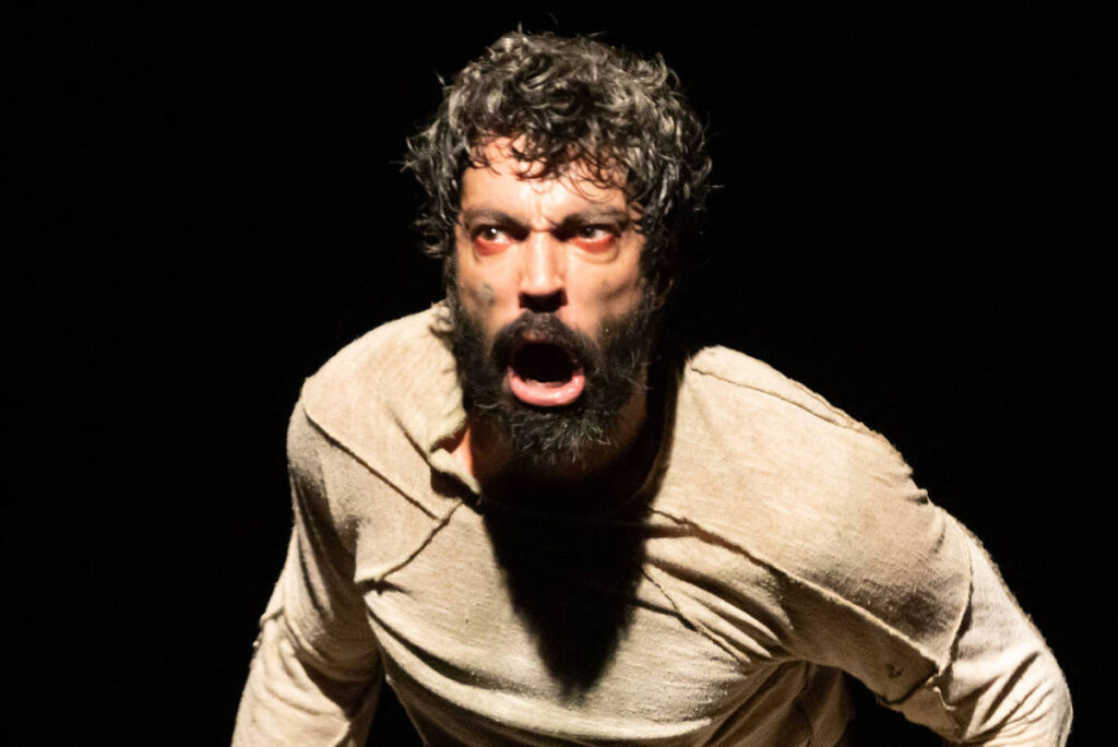 A direção de André Paes Leme estabelece um jogo de distanciamento necessário. Não há interesse no ilusionismo da lida no campo; o espetáculo assume sua “artificialidade” para que o espectador não se sinta um observador passivo, mas uma testemunha do processo. O minimalismo da cena, marcado por correntes e carcaças suspensas de Carlos Alberto Nunes, serve como moldura árida para o trabalho do ator, que se desdobra em três frequências distintas.