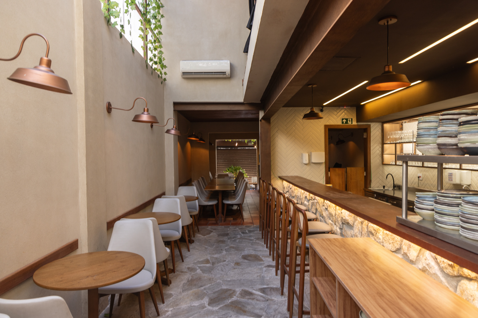 A partir do jantar desta sexta (7), o AE! passa a funcionar no número 343 da Rua Áurea (antes ficava no 285). Nesse endereço, salta de trinta para cinquenta lugares e tem ainda uma área no piso superior para eventos. Não é só. Os chefs e equipe passam a trabalhar em cozinha aberta. “Estruturalmente, não mexemos em nada. Foi um achado. Mas o Ygor era super contra essa ideia (de cozinha à mostra), mas quando ele viu o espaço, adorou e quis encarar esse desafio”, conta Walkyria.