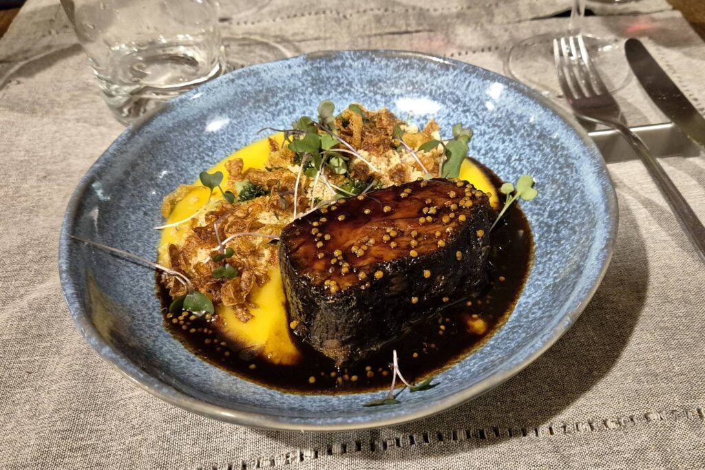 O purê brinca com o sabor da manteiga noisette —aquela que durante o preparo adquire aroma de avelã— e contrasta a textura aveludada com a crocância da farofinha de castanha-do-pará.