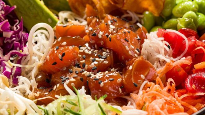 Outro destaque do cardápio do All Natural que volta para o cardápio de verão é a Mara Salad (foto). Neste ano, ela volta em três versões: camarãos, salmão cru e, para os vegetarianos, grão de bico. A base da salada é alface americana, pepino, cenoura e repolho roxo, muçarela de búfala, manga, tomates cereja e um mix de sementes e amêndoas. Tudo envolto em um vinagrete de maracujá.