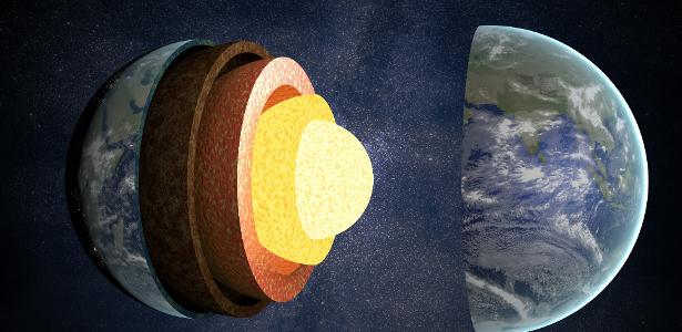 Imagem da Terra cortada com suas camadas à mostra com destaque para o núcleo do planeta