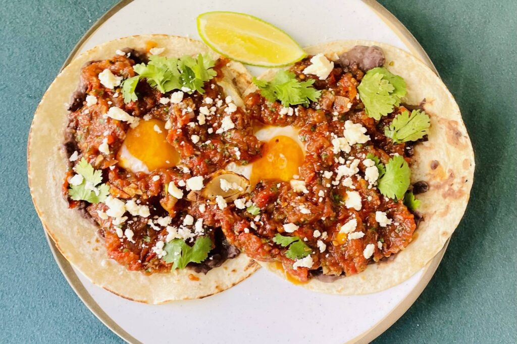 Quanto à receita, escolhi um clássico do café da manhã mexicano: huevos rancheiros, servidos com tortilha e molho de tomate. Huevos rancheros de gallinas de corral.