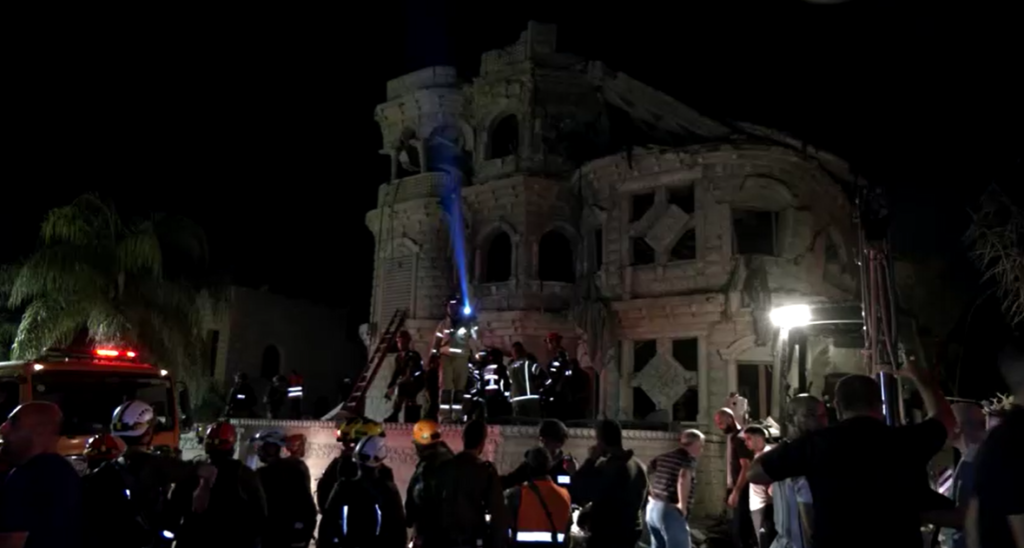 Vídeos compartilhados pelo serviço nacional de emergência de Israel, Magen David Adom, mostram um prédio gravemente danificado no centro de Israel, com destroços no chão.
