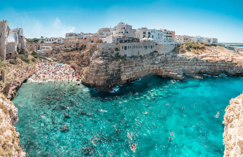 Estamos em Polignano a Mare, principal cartão postal da região da Apúlia —ou Puglia—, no extremo sul da Itália. Embora o país como um todo padeça com o turismo de massa, ainda dá para curtir as praias mediterrâneas dessa região, que corresponde ao salto da bota, sem enfrentar as multidões que hoje assolam a Sicília e a Costa Amalfitana, do outro lado da península.