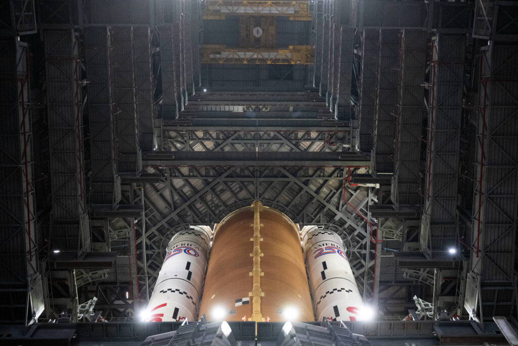 Neste momento, ele ainda está no VAB, o prédio de montagem de veículos –enorme instalação que permite a integração do lançador de 98 metros antes do voo.