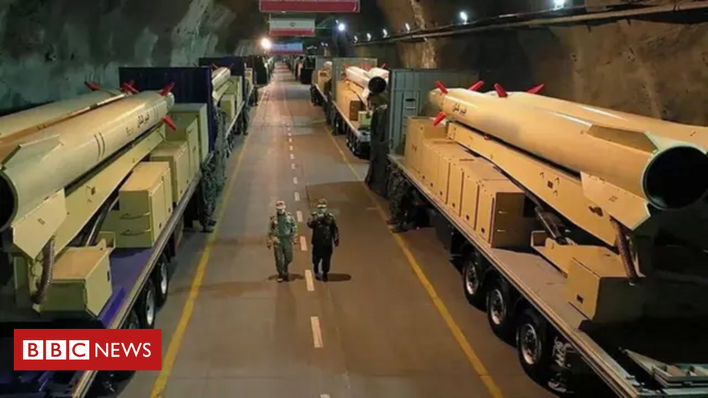 O general de brigada Amir Ali Hajizadeh, comandante da Força Aeroespacial da Guarda Revolucionária do Irã, revelou a mais recente “cidade de mísseis” em um vídeo que mostra mísseis balísticos e drones suicidas nas profundezas do subsolo, em entrevista à IRIB, emissora estatal. A BBC não tem condições de verificar de forma independente o que o vídeo alega mostrar.