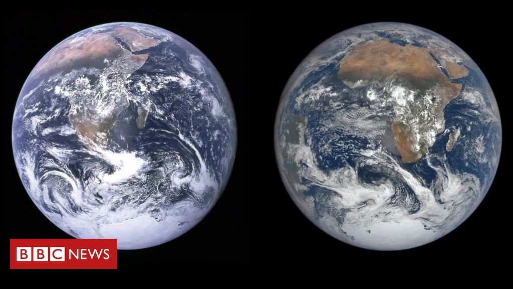 Legenda da foto, A icônica Blue Marble ao lado de uma fotografia tirada 50 anos depois