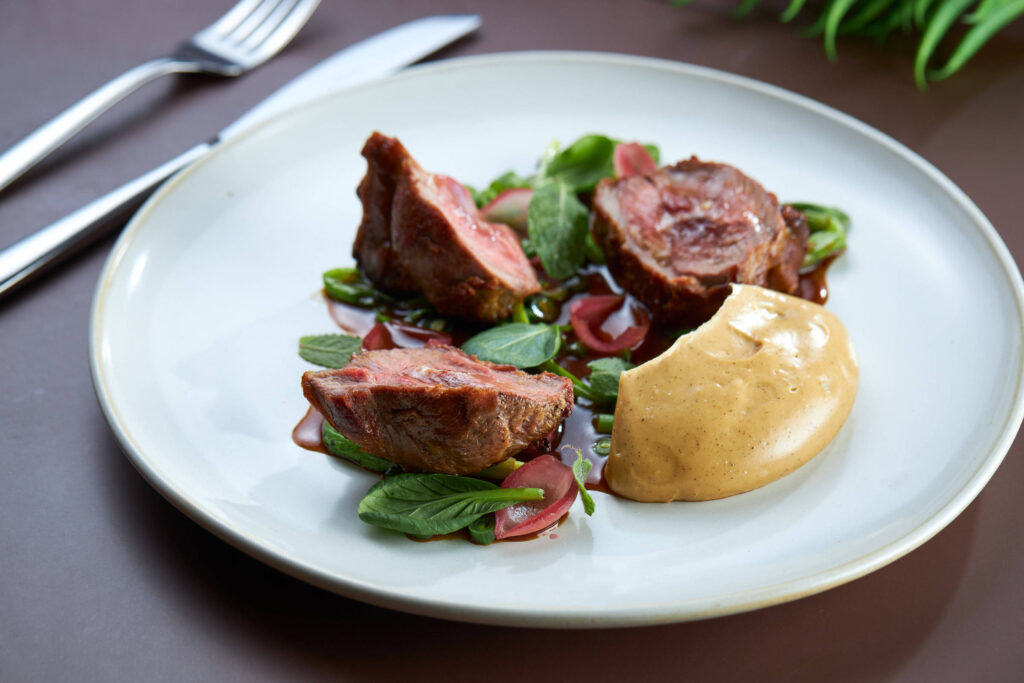 Picanha de cordeiro grelhada, purê de castanha de caju, ervas frescas, vagem holandesa e picles de cebola, do Vista