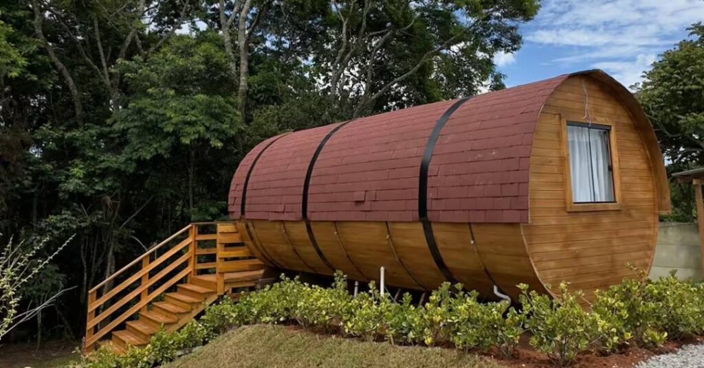 Homenagem à produção de vinhos da região, o barril chalé 77 simula um barril de madeira – só que com cozinha equipada, ar condicionado e ofurô dentro. Os hóspedes também contam com um espaço externo, com mesas e local para fazer fogueira.