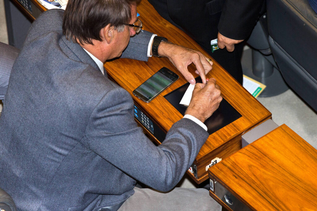 Bolsonaro era candidato à Presidência da Câmara dos Deputados e preenchia uma cédula de votação no momento do registro. Ele ficou em último lugar no pleito com apenas quatro votos, e dava uma bronca em Eduardo por não ter comparecido à sessão.