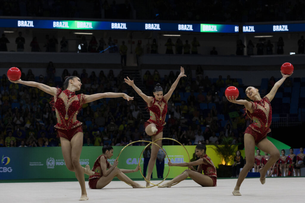 Mais cedo, a equipe não teve o mesmo desempenho na série com cinco fitas, primeira apresentação das brasileiras neste domingo. As atletas cometeram erros graves e mostraram desempenho bastante inferior à apresentação do dia anterior, obtendo a nota 22.850 —no sábado, o quinteto alcançou 27.400.