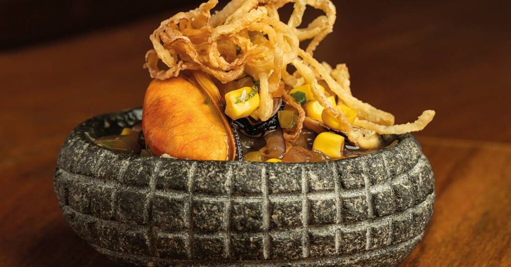 El tico (R$ 54,00) dá nome ao ceviche de mexilhão com vieira fatiada em leite de tigre com toque de pasta de amendoim e pimentão assado, coberto por cebola frita.