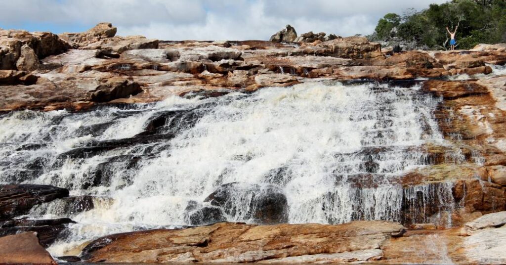 A queda d’água tem cerca de 10 metros de altura e forma uma prainha de água doce, boa parte dela é rasa, o que torna o lugar ideal para quem viaja com crianças ou só quer curtir uma tarde sem pressa. O cenário mistura rochas, vegetação nativa e um contraste da areia branca com o verde ao redor.