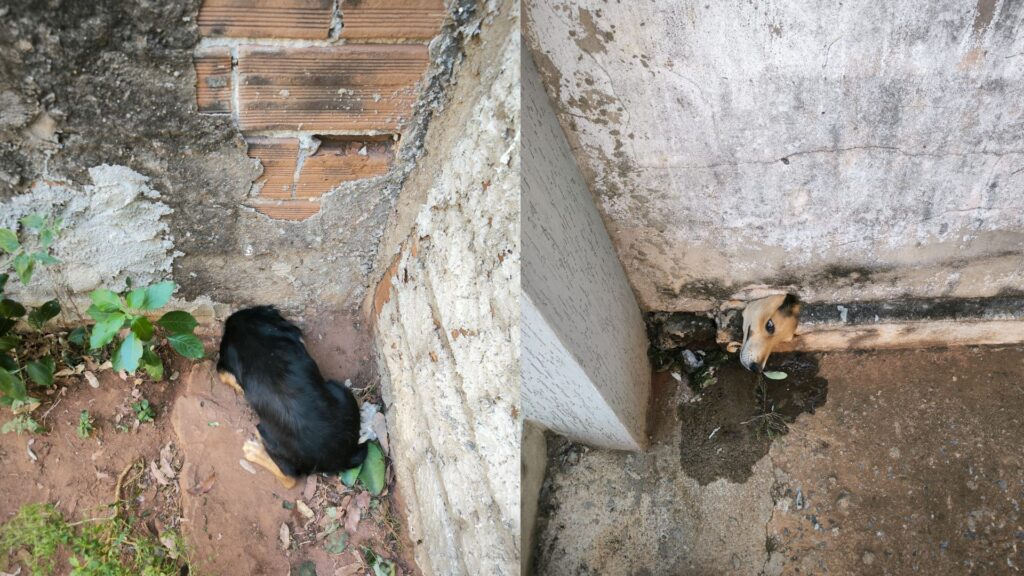 Ao chegar ao local, a equipe constatou que o animal havia introduzido a cabeça em uma saída de água pluvial, localizada na parte inferior do muro da residência, ficando imobilizado pelo pescoço. Com o auxílio de uma marreta e uma talhadeira, os Bombeiros criaram espaço suficiente para que o cão pudesse ser retirado.