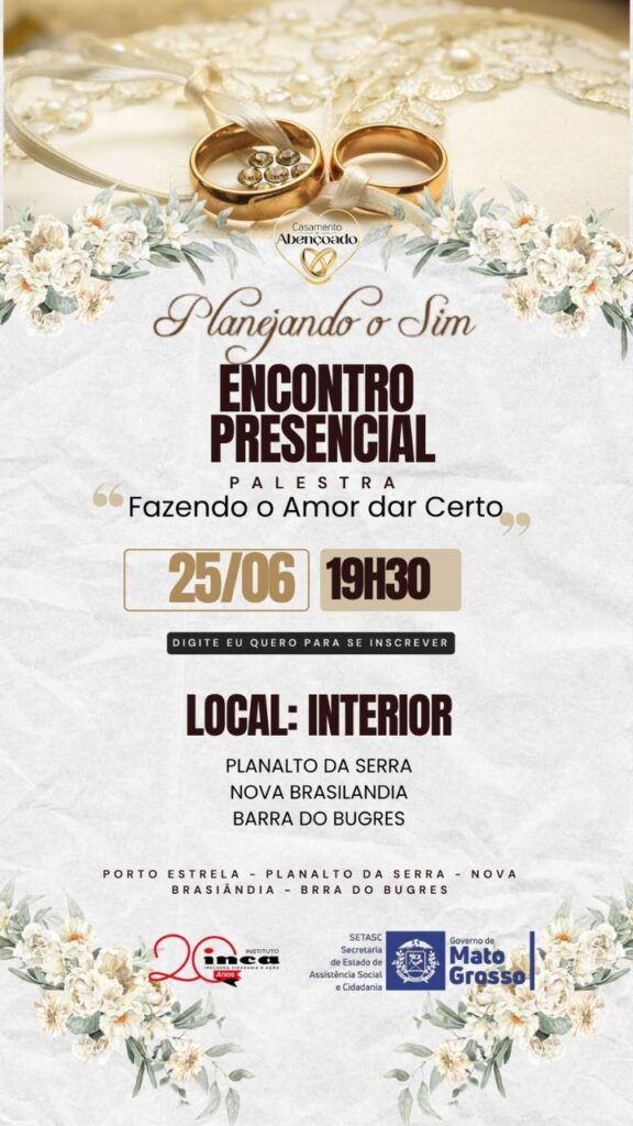 O projeto social “Planejando o Sim” chega novamente aos casais dos municípios de Mato Grosso, Nova Brasilândia, Barra do Bugres e Planalto da Serra com a renomada coach Iracema Irigaray, que traz o tema “Fazendo o amor dar certo”, nesta quarta-feira (25.06), com transmissão ao vivo pelo Youtube Instituto INCA MT, às 19h. E presencialmente, em Várzea Grande, no mesmo horário, na Faculdade Católica de Mato Grosso, nesta quinta-feira (26). Mais de 140 casais, além de convidados e autoridades dos municípios, aguardam por esse evento que impacta relações matrimoniais, em um ambiente todo preparado: acolhedor, decorado, com buffet e coquetel completo, música ao vivo com voz e violão, também sorteio de brindes. O evento é gratuito!