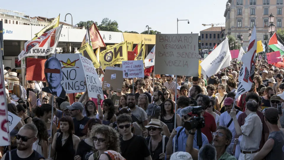 Enquanto os recém-casados se preparavam para mais uma festa, no sábado à noite, manifestantes empunhavam cartazes com frases como “Beijos sim, Bezos não”, “Sem Bezos, sem guerra” e “O planeta está pegando fogo, mas aqui está a lista dos 27 vestidos de Lauren Sánchez” – uma crítica direta à ostentação dos trajes usados pela noiva, incluindo um vestido de noiva estilo sereia da Dolce & Gabbana, além de looks de estilistas como Schiaparelli e Bottega Veneta.