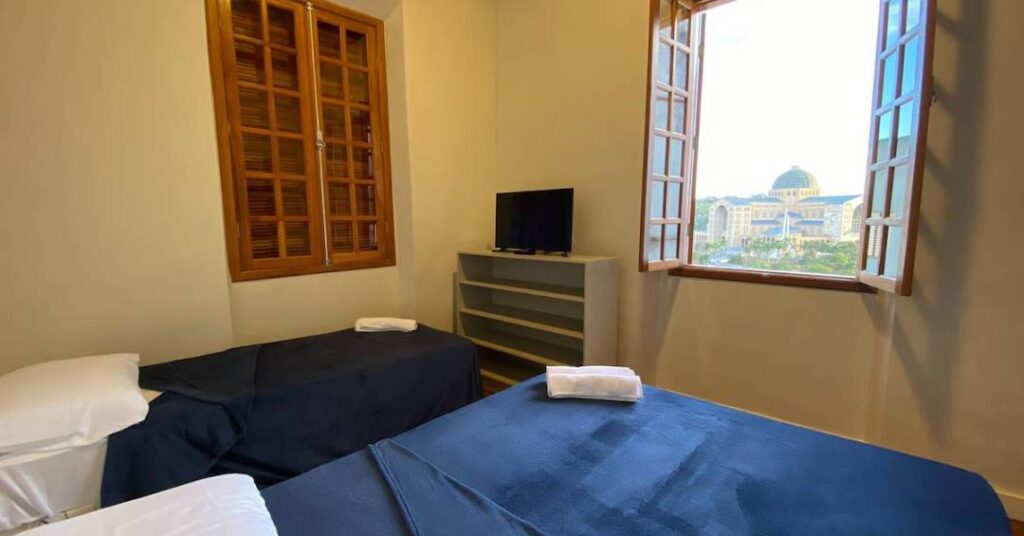 Comentário de quem já alugou: “Bem localizado, perto de lojas e com fácil acesso à Basílica e ao Santuário. A estrutura do casarão é espetacular, ele está muito bem conservado. E o vento que bate lá? Que delícia de ficar na sacada e escutar os sinos.” – Daniela, janeiro de 2025.