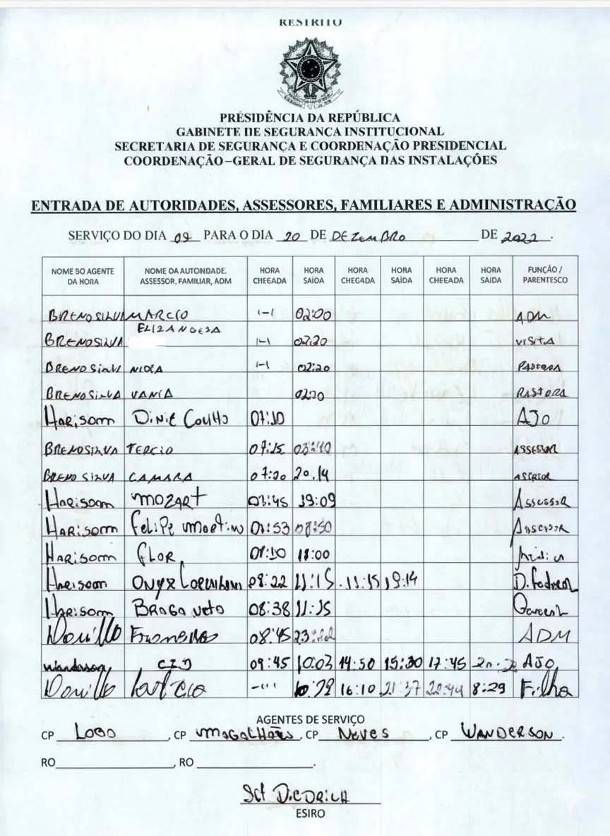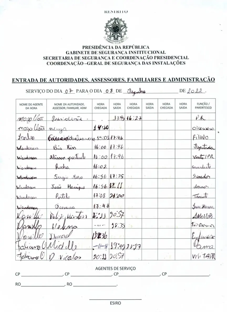 A entrada e saída de autoridades e assessores no Alvorada é um fato comum, e o nome na lista de registros não atesta a presença de nenhuma delas em uma reunião específica.