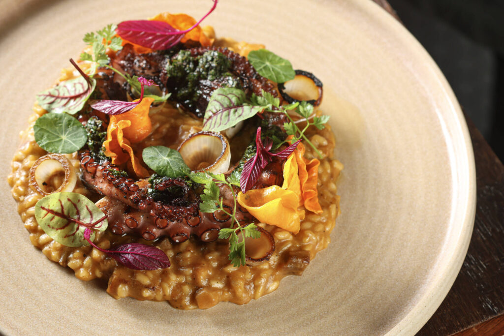 Na mesma linha vem o espetinho de polvo (R$ 73), que chega à mesa com mil-folhas de batatas crocantes e molhos como iogurte grego, romesco e chimichurri.