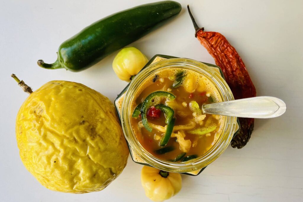 - As quantidades vão depender do tamanho do seu pote. Recomendo um vidro pequeno, com cerca de 150 ml, porque se trata de suco e pimentas frescos, bastante perecíveis