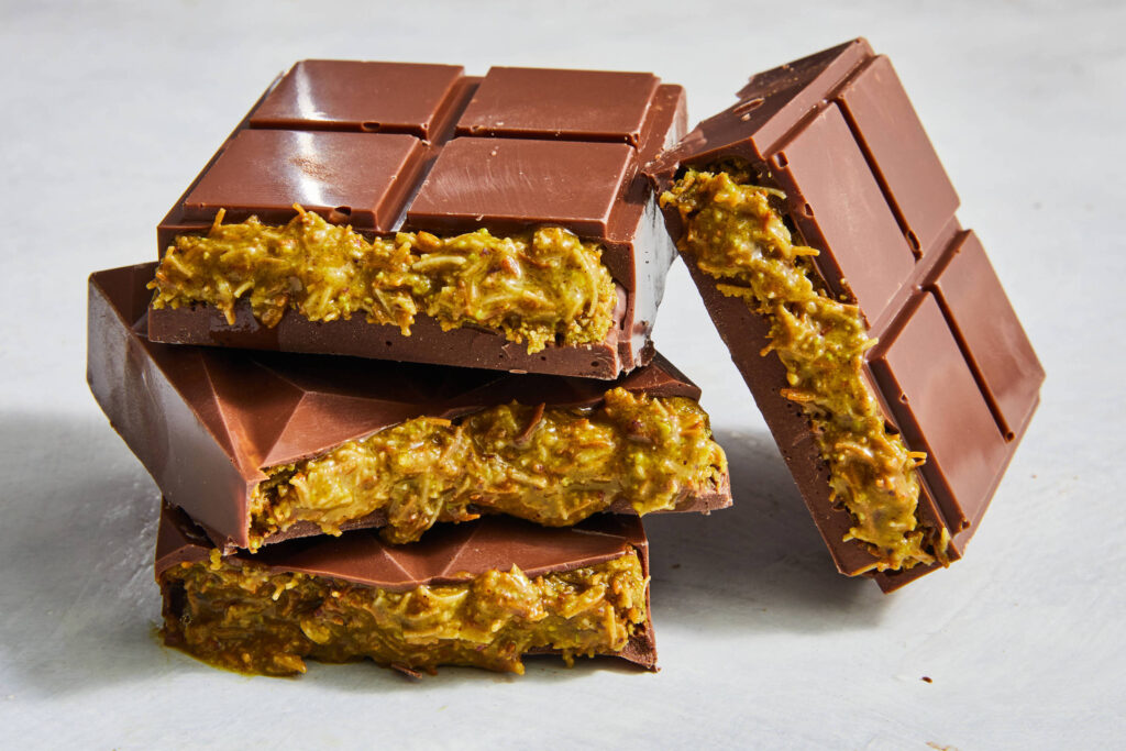 À medida que se tornou viral globalmente, ficou conhecida como chocolate de Dubai e inspirou muitos a criarem suas próprias versões em casa. E é fácil entender por que —a guloseima é uma combinação dos sonhos de creme de pistache envolto em uma casca crocante de chocolate sedoso.