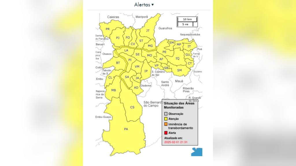 A cidade de São Paulo está em estado de atenção para alagamentos na noite deste sábado (1º), segundo o Centro de Gerenciamento de Emergências Climáticas (CGE).