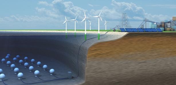 Quando há baixa demanda de energia, a esfera é esvaziada. Isso cria um vácuo dentro do tanque, que passa a armazenar energia na forma potencial.