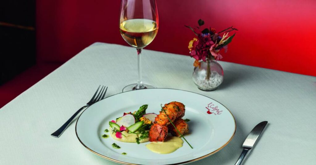 Escolhe-se entre dois pratos principais, ambos de pescados: a moqueca de cavaquinha, camarão e lula com arroz de jasmim e farofa crocante ou a lagosta grelhada ao zabaione de champanhe com aspargo salteado, musseline de batata e rabanete.