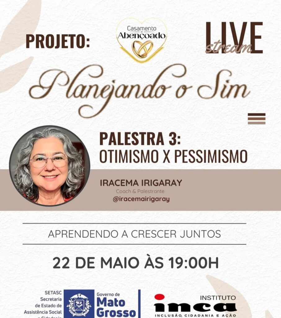 Mais um encontro do projeto social “Planejando o Sim” será realizado nesta quinta-feira (22.05) e desta vez a temática levantada pela renomada coach Iracema Irigaray, quem conduz a palestra, é “Otimismo X Pessimismo”. Importante em qualquer ambiente e relacionamento, seja pessoal ou profissional, é ainda maior no relacionamento de casais, pois quando se escolhe estar juntos é pelas qualidades, então se apaixonam.