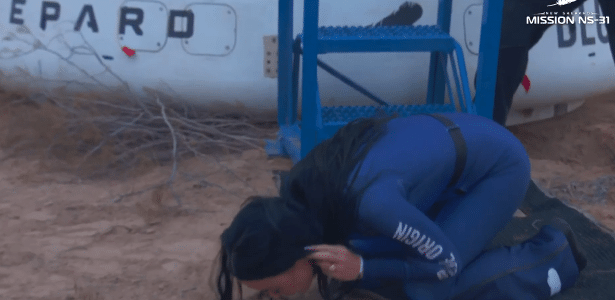 Cantora Katy Perry beija o chão após voltar de viagem espacial da Blue Origin, empresa espacial de Jeff Bezos Imagem: Reprodução