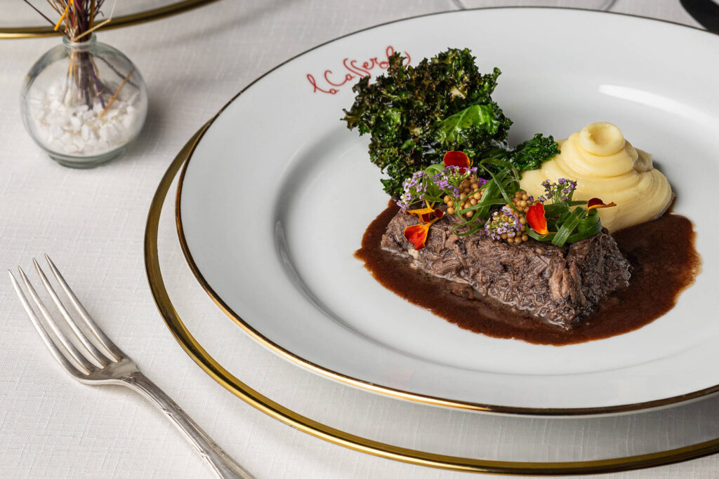 O restaurante foi inaugurado em março de 2024 e, desde junho deste ano, tem cardápio assinado pelo chef Erick Grossi, também responsável pelos pratos do Les Deux Magots. Servido com purê de batatas, o bife Wellington, envolto em cogumelos e massa folhada, é apresentado como a especialidade da casa (R$ 105). Mexilhões com fritas (R$ 83) também garantem típicas refeições francesas.
