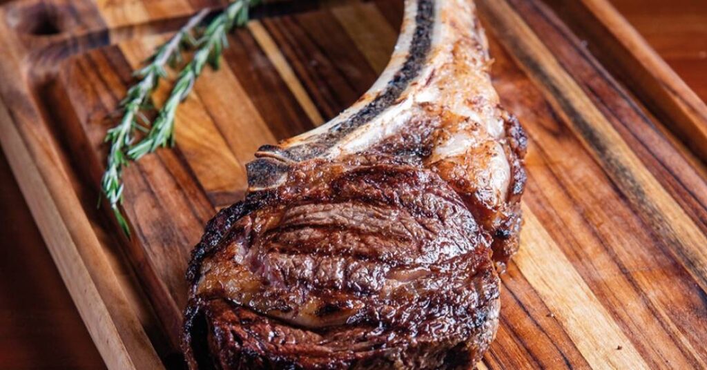- Variedade de carnes que inclui alcatra de vaca velha, tomahawk, ancho premium e barriga de porco dourada.