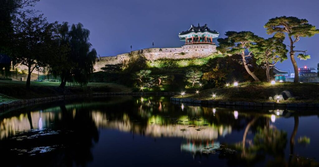 Hwaseong foi construída no final do século 18, com a obra sendo concluída em 1796. Além da muralha propriamente dita, a estrutura protege um palácio real – chamado Haenggung – e é atravessada pelo rio Suwoncheon, o principal curso d’água da cidade, que entra por arcos de pedra que estão entre os pontos mais fotografados do complexo. Ao todo, são quase 6 quilômetros de muralhas que chegam a 6 metros de altura protegendo o terreno, com quatro portões de acesso para a área interna, cada um voltado para um dos pontos cardeais.