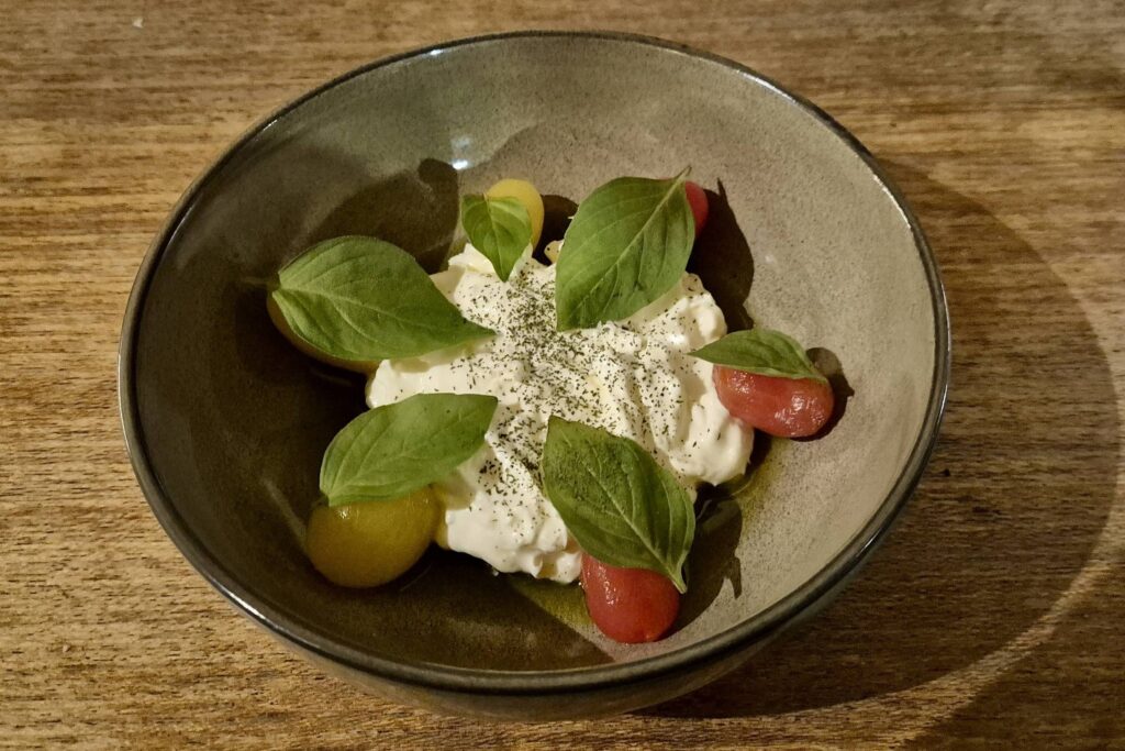 Na sequência, stracciatella. Chegou rodeada por tomates-cereja curados, sementes de abóbora e manjericão. Fresca, aveludada e bem-servida. Perfeita. Mas atende às expectativas de uma pizzaria, não de um restaurante autoral, provando o segundo prato de um menu-degustação de apenas cinco, que tinha começado com um couvert bom, mas simples.