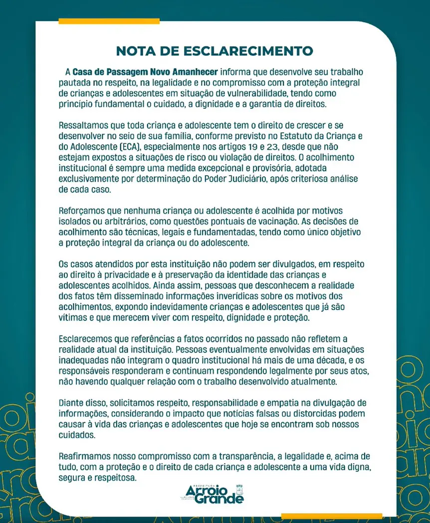 A nota apontou ainda que “nenhuma criança ou adolescente é acolhida por motivos isolados ou arbitrários, como questões pontuais de vacinação”, e que as decisões “são técnicas, legais e fundamentadas”.