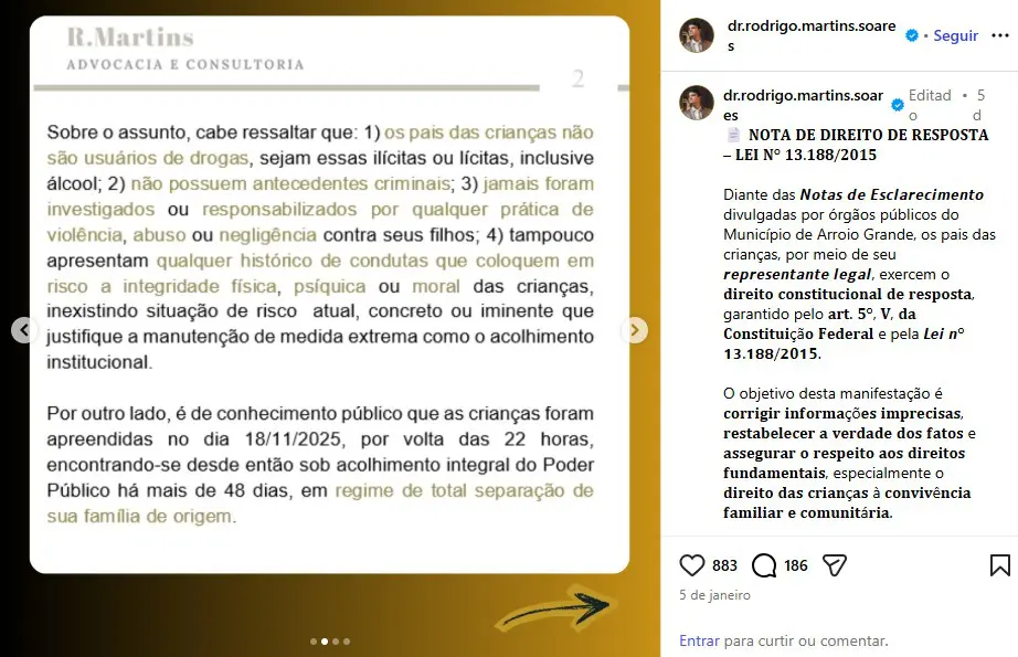 Para a defesa, não há qualquer situação de risco atual, concreto ou iminente que justifique a manutenção de uma medida extrema como o acolhimento institucional. “Quando as crianças retornarão ao convívio familiar, considerando que a família natural possui prioridade absoluta sobre qualquer forma de acolhimento institucional?”, questiona, em nota.