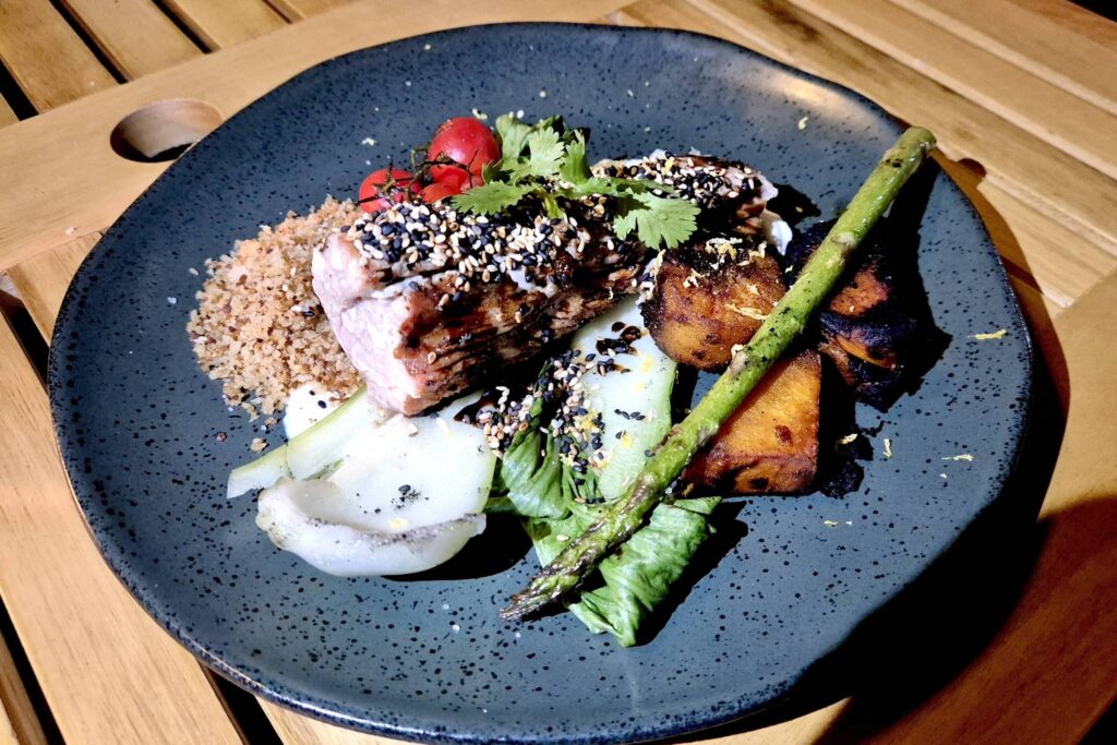 De principal, o atum na brasa (R$ 96) é acompanhado por batata-doce assada, acelga japonesa com uma ou outra gota de uma redução à base de vinho do Porto e balsâmico, três tomates-cereja e farofa de alho. Um pouco de coalhada tentava amenizar, em vão, a secura do prato.