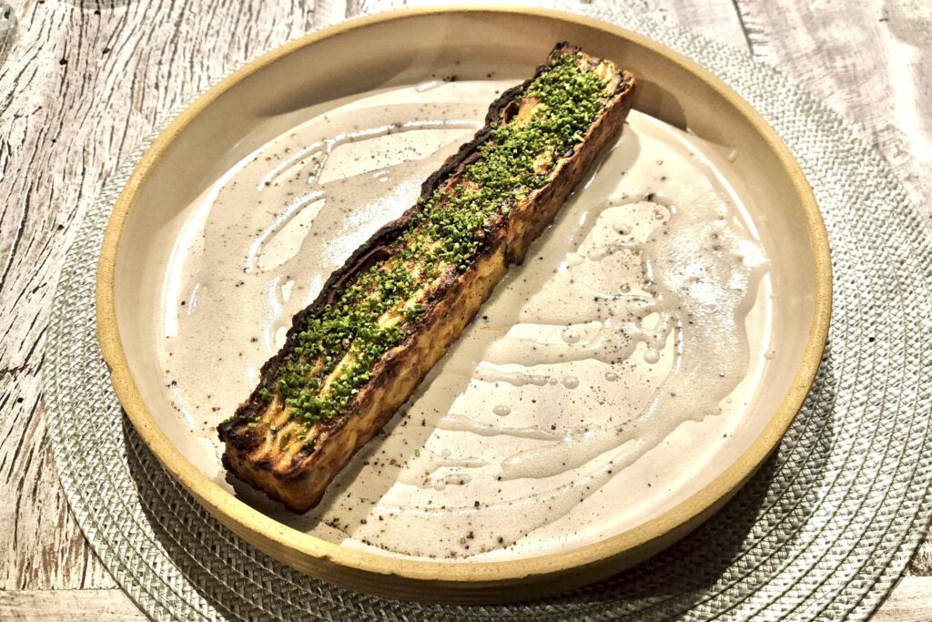 A porção de arancini cacio & pepe (R$ 48) vem com magret de pato curado. Bem marcado, ele toma conta do sabor (mas de um jeito bom), e deixa com os bolinhos a função de conquistar pelas texturas: crocantes por fora e cremosos por dentro.