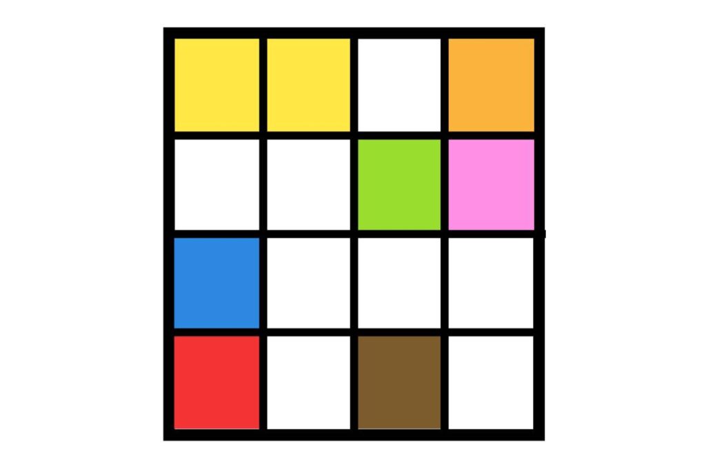 Yumi ganhou um jogo de tabuleiro com 16 fichas de 8 cores diferentes, como na ilustração a seguir.