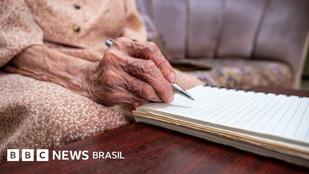 Foto de uma pessoa idosa segurando uma caneta sobre um caderno.