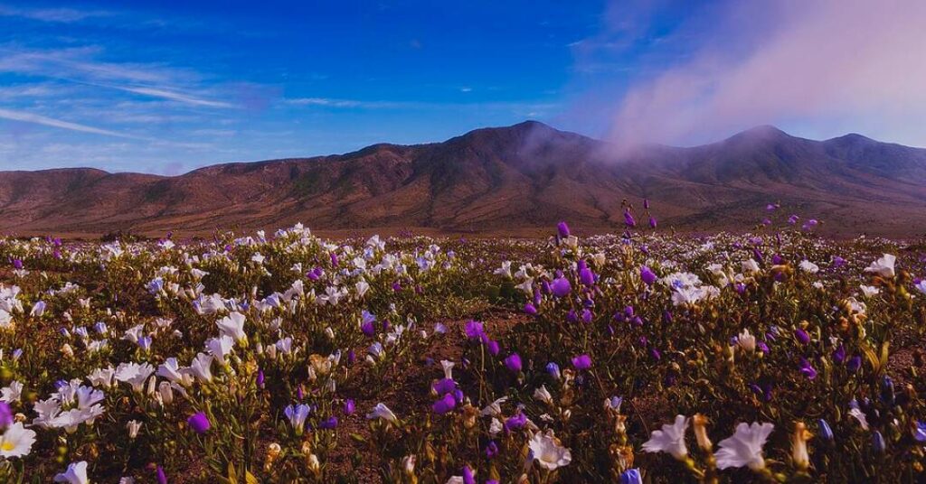 A primavera é conhecida como a estação das flores, mas elas nem sempre se fazem presentes no deserto. No norte do Chile, o Deserto do Atacama, considerado o mais seco do mundo, voltou a se cobrir de tons roxos, brancos e rosados neste mês de outubro, em um fenômeno relativamente raro conhecido como “deserto florido”.