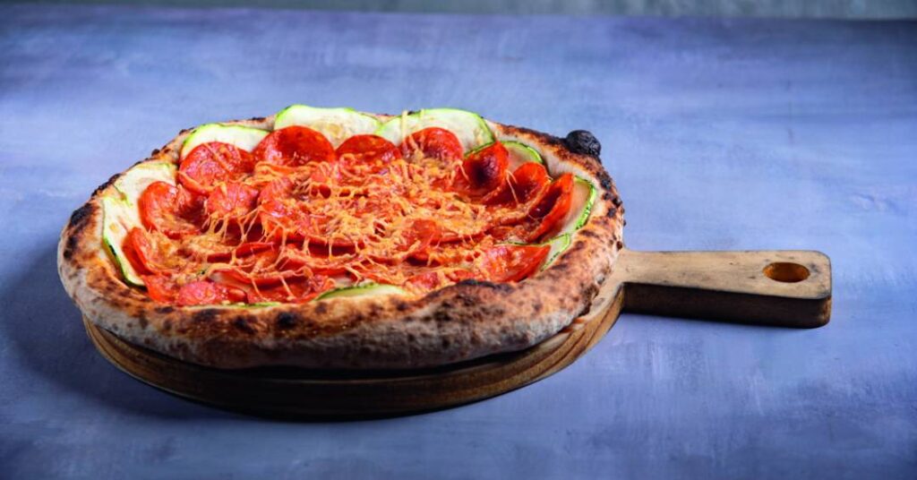 Pizza sendo finalizada em mesa de madeira