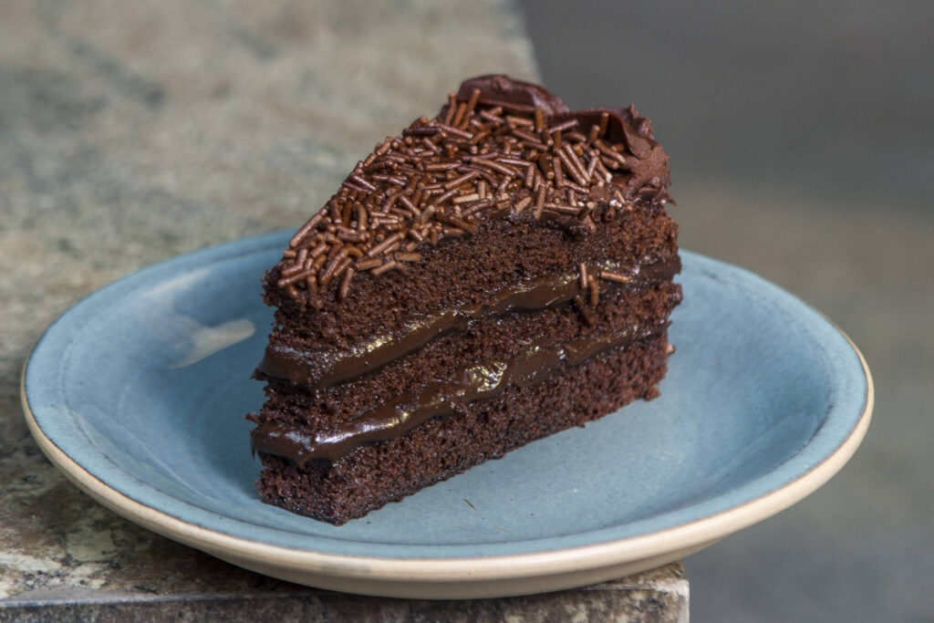 - Divida o bolo em duas camadas, recheie generosamente, cubra com o restante do brigadeiro e finalize com granulado