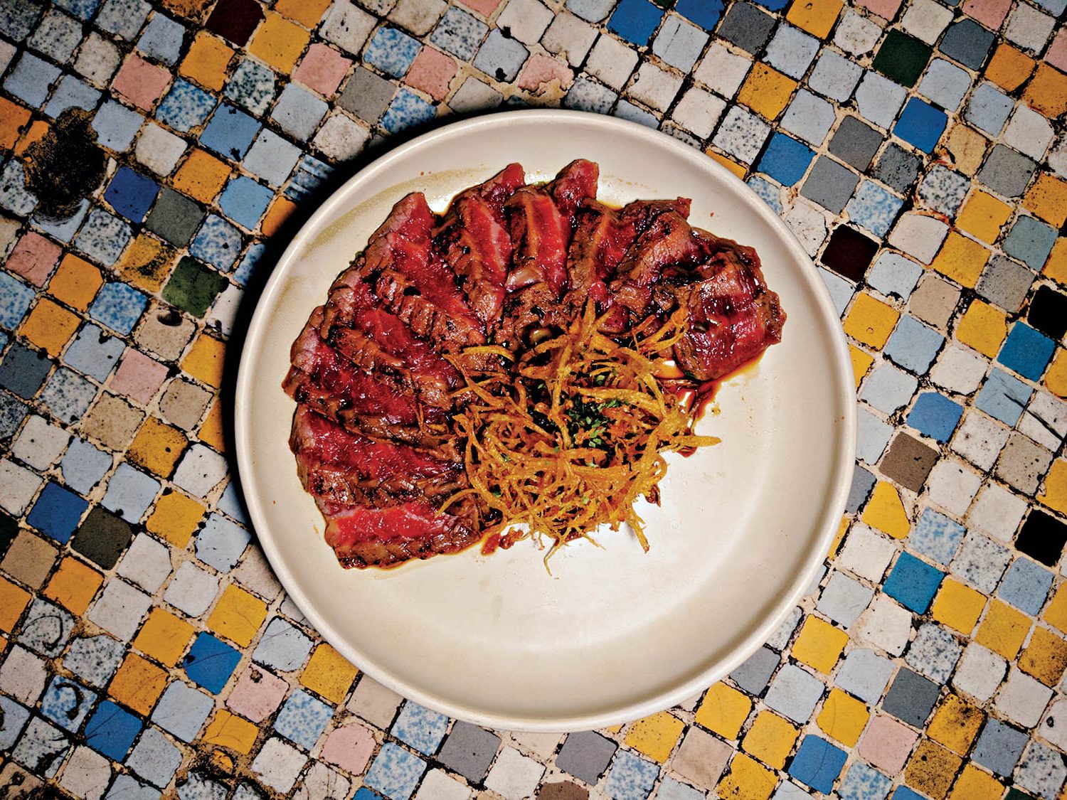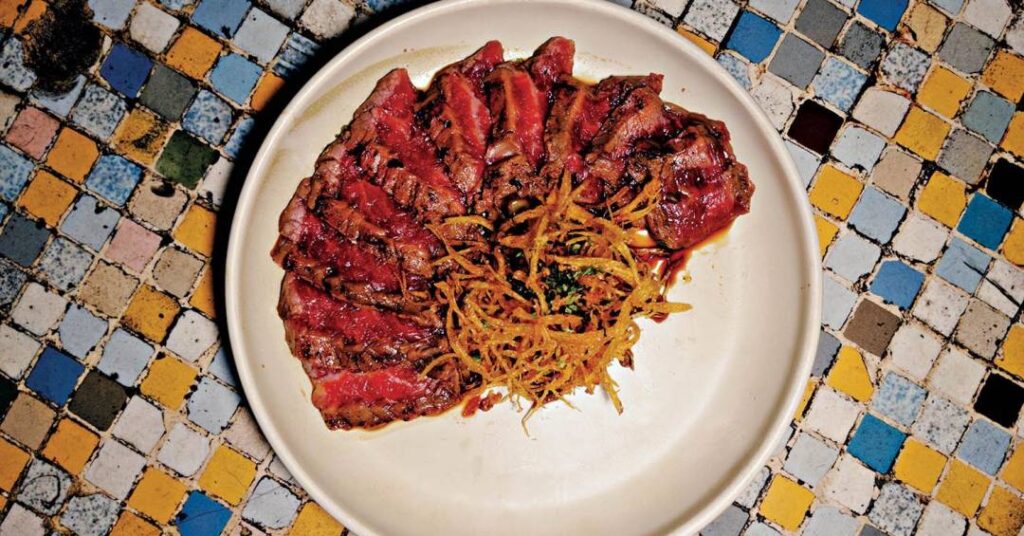 As comidas, com influência asiática, ganham toques latinos com a chegada da chef argentina Antonella Caruso. Um exemplo: tataki de vacío (ou fraldinha) com ponzu de folhas de limão kaffir e batata palha (R$ 110,00).